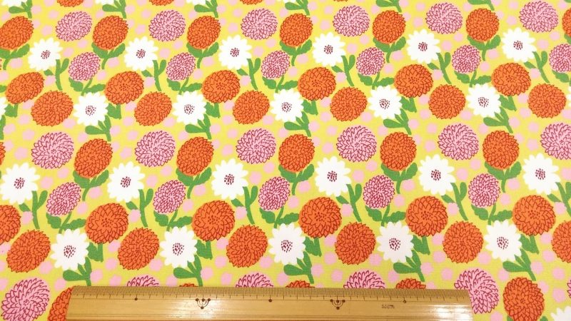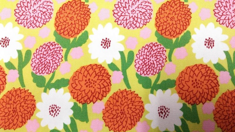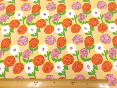| 商品説明 | 生地には両端およそ2cmに余白にメーカー名、又、加工の際に出来る細かいミシン目の様な穴が有り、それを含めての生地の幅110cmの表記になります。 丸く咲くダリアが鮮やかに咲き乱れます。 |