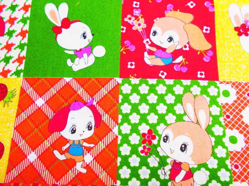 | 商品説明 | 生地には両端およそ2cmに余白にメーカー名、又、加工の際に出来る細かいミシン目の様な穴が有り、それを含めての生地の幅110cmの表記になります。 レトロのウサギとバンビのパッチワーク柄。 チェック、花柄など懐かしい柄が一杯です♪ 1つの四角の大きさ約7,5cm |