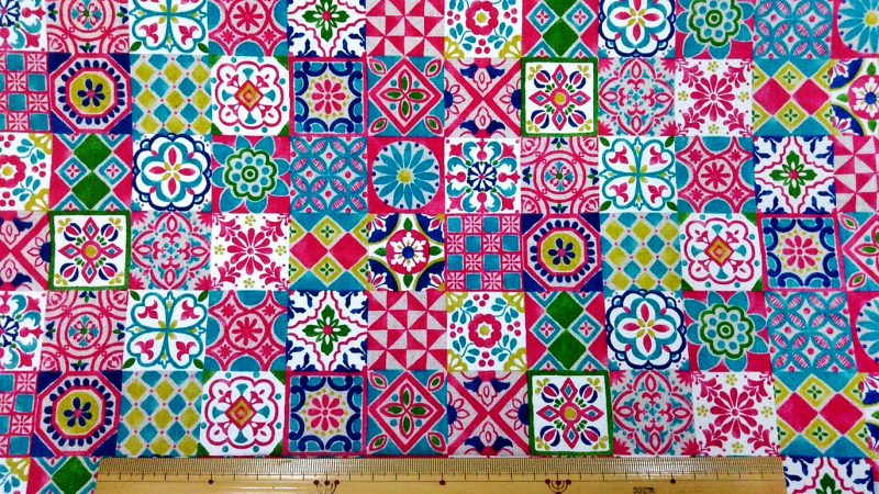 | 商品説明 | 生地には両端およそ2cmに余白にメーカー名、又、加工の際に出来る細かいミシン目の様な穴が有り、それを含めての生地の幅110cmの表記になります。 エキゾチックな雰囲気の柄がパッチワークのように並びます 四角は約4.8cmです。 |