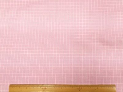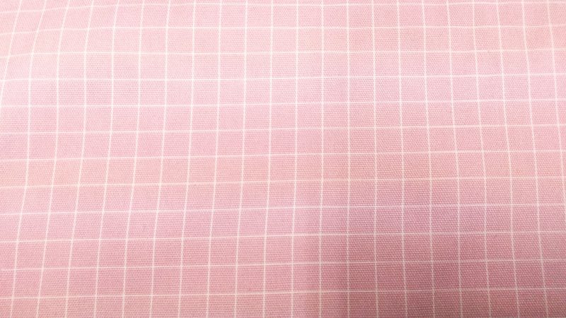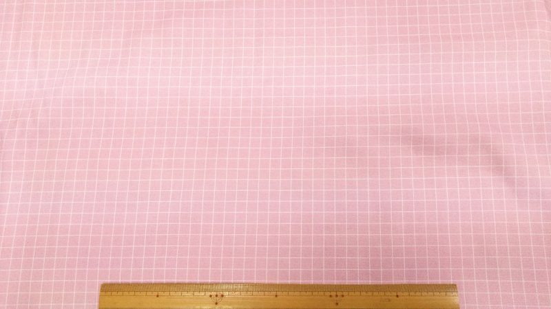 商品説明 | 生地には両端およそ2cmに余白にメーカー名、又、加工の際に出来る細かいミシン目の様な穴が有り、それを含めての生地の幅110cmの表記になります。 約1cm角のホウガンの様な格子柄です ピンクの色に白の線です |