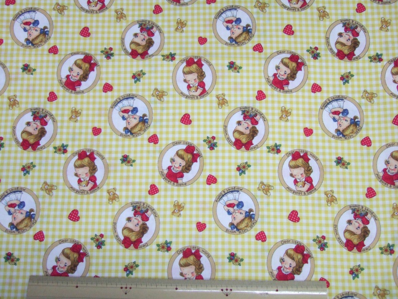 | 商品説明 | 生地には両端およそ2cmに余白にメーカー名、又、加工の際に出来る細かいミシン目の様な穴が有り、それを含めての生地の幅110cmの表記になります。 約4mmのギンガムチェックの中にラブリーな女の子がいます♪ 円の大きさは約5cm 切り取ってワッペン作っても可愛いね! お子様のお洋服はもちろん、小物にも最高☆ |